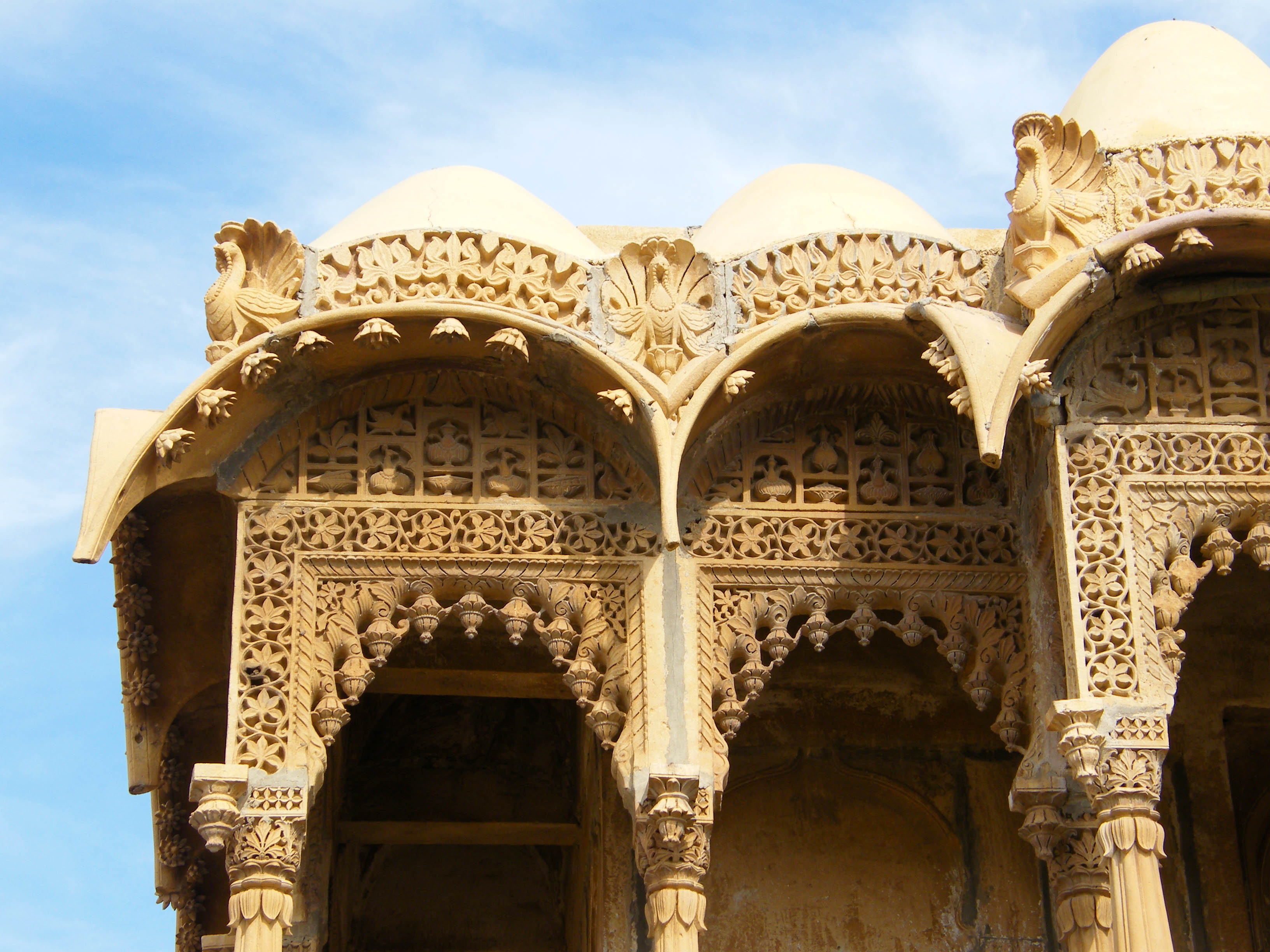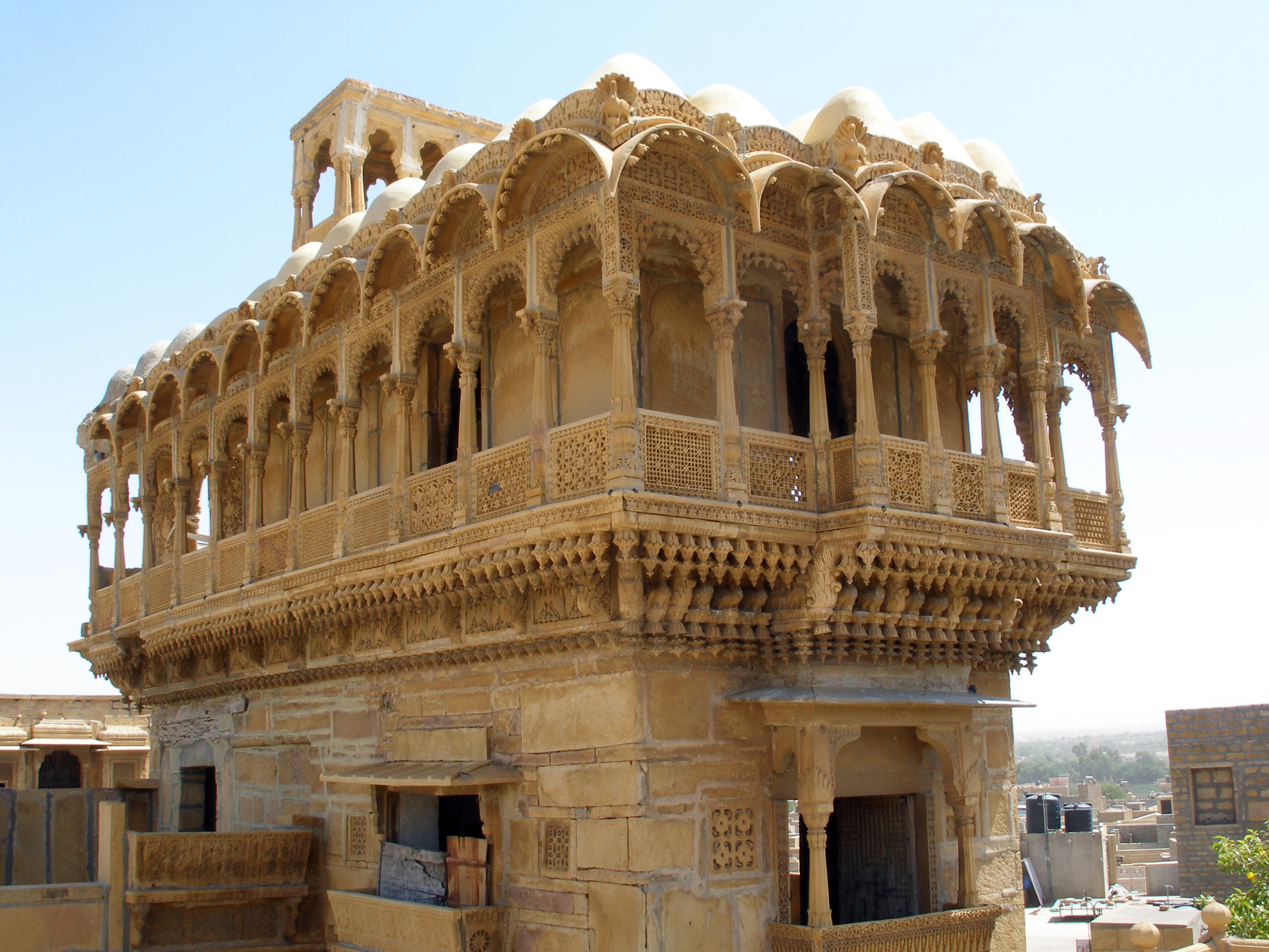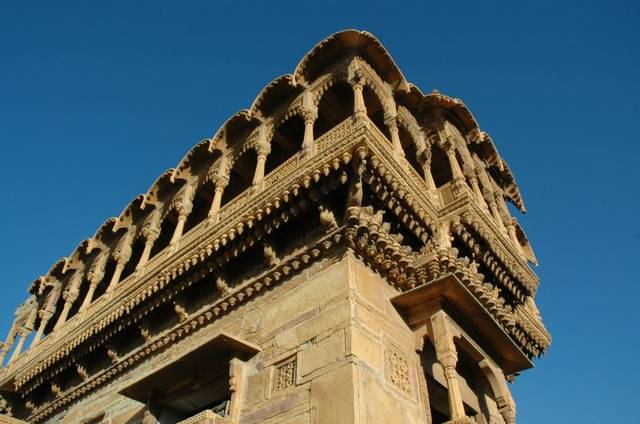 salim singh haveli 3Salim Singh’s father, Prime Minister Swarup Singh Mehta was beheaded by the heir apparent from the Bhati family in dispute over a maiden and a debt. At the young age of 11, Salim Singh swore revenge and eventually, he eliminated many rivals. He ensured that many members of the ruling family were in his debt and therefore wielded a significant control over the kingdom. The Haveli was his home and has 6 stories and is interestingly narrow at the base and grows wider with each level. It has 38 impressive balconies and carved peacocks adorn the four corners of the top floor of this truly magnificent structure. A walk through these balconies will show that each has been built and adorned in a different style with exquisitely carved brackets and arched roofs. In fact, the front facade of the Haveli is cleverly designed to resemble a ship. Thus the Haveli is also sometimes called Jahaz Mahal.